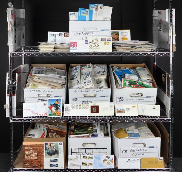 20th & 21st Century, Topically Themed Mainly FDC, Massive Stock Lot, as formed by the late Richard Ellis,easily 25,000 plus covers originally jammed in 75 shoe boxes, mostly cacheted (less than 5% uncacheted), many different and some obscure and limited edition creations and desirable cachetmakers, of course plenty of Artcraft, Fleetwood, House of Farnam, many of the covers artfully franked with multiple issues, sometimes sopanning decades, unique creations in their own right (see feasture image), quantities of up to about 10 opf some and maybe a few 25 to 50, this includes events, anniversaries, Hells Half Acre, Inaugurals (many hundreds), military, aviation, automobiles, arctic. Xmas, Kwanza, New Year, Black History, Sports, Movies, celebrities, Olympics, statesmen, stamp shows, super bowls, baseball, football, from Barack to Marilyn, Lindy to Elvis and JFK, its all here with plenty of potential, tremendous high five figure retail potential, a lot that should be seen to be appreciated, generally very fine, a low guess is that there are over 25,000 covers but could be closer to 35,000, judge for yourself. Shipping charges apply - weight 390 lbs. (Image)