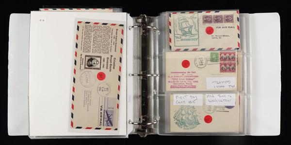 First Day Cover Collection, 1920s'-1940's, in several albums of home-made pages, with plenty of better items that include: 630 souvenir sheet registered airmail FDC dated on the premium date of October 18th with a Scott value of $1,800, 740-49 perforated Park singles and 756-65 imperforate park block of four FDC's on Dyer cachets along with a selection of other Farley Dyer FDC's, two 740-49 perforated park sets on Beverly Hills cachets, 785-93 Army Navy two sets of FDC's on Grandy and Dyer cachets, 1938 Presidential complete set of Ioor first day covers, 859-93 Famous American set of Artcraft first day covers and mint plate blocks, C25-31 set of mint plate blocks and FDC's on Artcraft cachets. In addition, you will find a box with various first days, postcards or whatever else happened to catch this collector's eye, generally Very Fine. Shipping charges apply - weight 232 lbs. (PDF for this Lot) (Image)