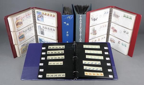 Plate Number Coil First Day Covers, with Stamps, 1982-92, three volumes of PNC First Day Covers from dozens of artists; includes Gamm, Spectrum Covers, ArtCraft, Artmaster, Basil, House of Farnam, Aristocrat, Gil Craft, Colorano Silk, plus two volumes of coil strips; considerable stock of coil strips from #1897//2523, souvenir pages, EFOs (no tagging, misperf, etc.), about $50 in Seaplane Face Value alone; PNC specialists take note, Fine to Very Fine. Shipping charges apply - weight 21 lbs. (Video for this lot) (Video2 for this lot) (Video3 for this lot) (Video4 for this lot) (Video5 for this lot) (Image)