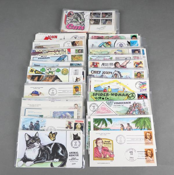 Collins Premium Cachets Collection, 1983-2019, approximately 350 First Day Covers individually sleeved with Fred Collins artwork; includes Elvis, Cats, Civil War, Classic Aircraft, Legends of Baseball, Winter Olympics, Lighthouses, Classic Comics, Movie Stars, State Birds, Circus, Country Music, Legends of the West, and much more; pristine condition and quite collectible, Very Fine. Shipping charges apply - weight 8 lbs. (Image)
