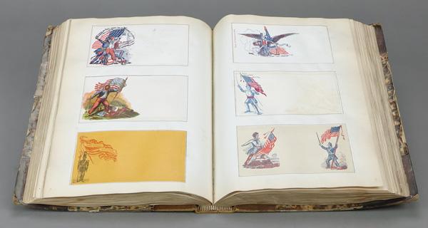 Collection of Patriotic Cover Fronts, 1865, a collection of 630 different Patriotic envelope fronts glued into a printed album published at the end of the conflict collected by Charles C. Moreau; a fabulous historical reference with the interior in good condition while the exterior destroyed by water damage; don't judge this book by its cover and you will be pleasantly surprised, Very Good. Shipping charges apply - weight 5 lbs. (Video for this lot) (Video2 for this lot) (Image)