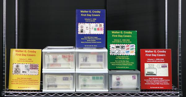 Crosby Cacheted First Day Covers, 1930s-40s, approximately 1500-1600 in total, including #804-832, 835/858, 859-893, 894-980, C23, C25-C38, C25a, E17, E18 & UC17 and a few 1939 Canal Zone issues, wide variety of Crosby cachets, some duplication as always, in Scott order in 5 plastic tubs with the Famous Americans filling one tub, also includes Kenneth Stern's definitive 5 Volume work on Crosby FDCs 1928-1949, Very Fine, see Nos. 804-921 online (first 3 tubs). Shipping charges apply - weight 47 lbs. (PDF for this Lot) (Image)