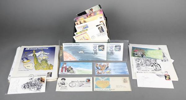 Doris Gold Estate First Day Cover Remainder, 1978-2017, approx 350 covers as well as pre-production original art from the Doris Gold Estate; mild duplication of FDCs between 1978 and 2017; original artwork includes Elvis pencil drawing of hound dog, 1989 Express Mail International pencil drawing, pair of Joe Louis pencil drawings with four hand drawn overlays, Bugs Bunny and Elmer Fudd hand drawn watercolor, Snow White hand drawn watercolor with applique, 2014 Christmas scene hand drawn watercolor, stunning 1992 full sized animals plus reduced on acetate and finally hand drawn watercolor, La Mesa Post Office original (never used), Halley Elizabeth Wolf Bat Mitzvah original art, and much more; essential for the Doris Gold specialist. Shipping charges apply - weight 7 lbs. (PDF for this Lot) (Image)