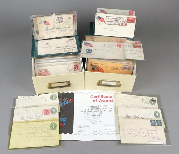 Spanish-American War Patriotic Cover Collection, 1898, approximately 350 mostly red & blue with many scarce designs including five franked with foreign stamps (China to Canada, Germany (card mailed within Germany), Great Britain, India with C.E.F. overprints (part cover) and Portugal, one used from Alaska, nine covers and one card with all-over flags (2 covers with text on reverse), and others with all-over designs, many with contents including letters or commercial advertising letters and such, very minor duplication, also includes 7 staging covers (4 with letters) sent before deployment, few faults as always on cover lots of this age and size, generally Fine to Very Fine, fully imaged online, ex J. Leonard Diamond, one of the premier collectors of Spanish American War postal history.