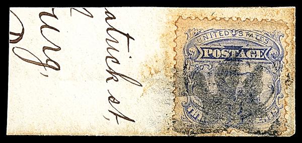 Waterbury, Ct. "Running Chicken" fancy cancel, in black, tying a 3¢ 1869 (#114) to a small full-corner piece, the strike light but full-figured; the stamp and piece with toning or staining, Fine to Very Fine, rarity RRRR - less than 6 examples known, with 2022 Crowe certificate. Rohloff A-11. Skinner-Eno PA-B 1. (Image)