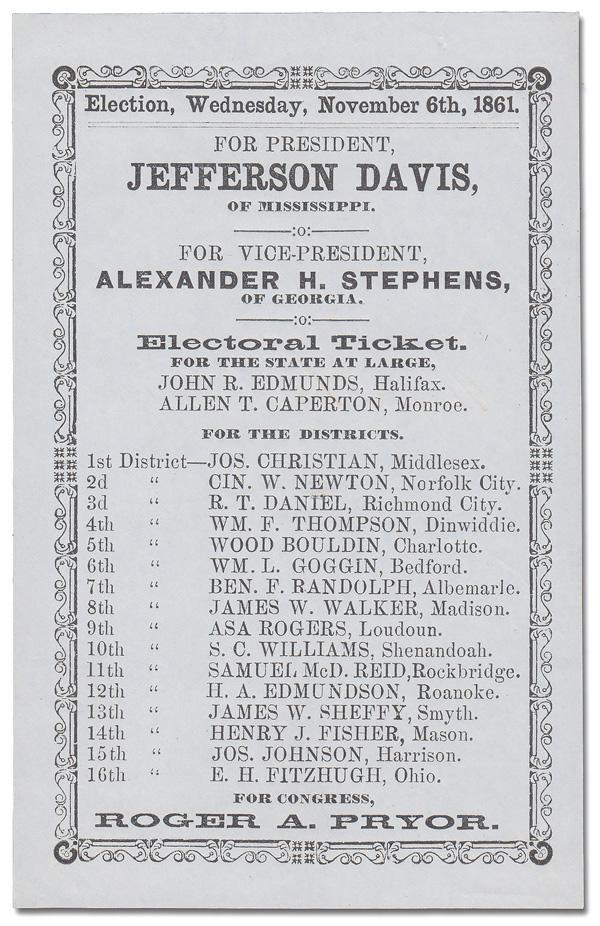 1861, Davis-Stephens Presidential Election Handbill, for the State of Virginia "Election, Wednesday, November 6th, 1861," listing Electoral Delegates for 16 Districts plus two at-large Delegates, and Roger A. Pryor for Congress, pristine condition, 4" x 6", signed on the reverse by "Alex H. Scoggins," presumably a voter, Extremely Fine. (Image)