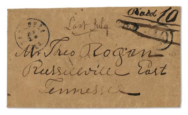 undated (Jun. 1?), Turned cover Tazewell Tenn to Russellville Tenn. then back to Tazewell then again to Russellville, "Tazewell Ten. Jun. 1?" circular datestamp with matching "Paid" and "10" in circle handstamps on homemade cover to Russellville Tenn., then turned and inside with vertical pair of #7 tied by "Russellville Tenn. Jun. 20" circular datestamp and sent back to Tazewell, outside then "Paid" and "10" in circle handstamps crossed out and manuscript "Last July" and "Paid 10" written and mailed back to original recipient in Russellville, opened for display, Very Fine. An incredible cover sent by two resourceful individuals; see the inside online, ex-Boshwit. Shipping charges apply - weight 3 lbs. (Image)