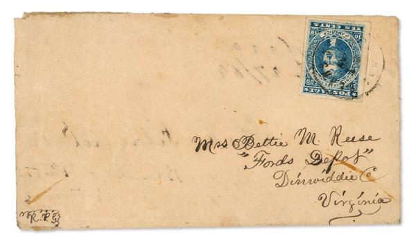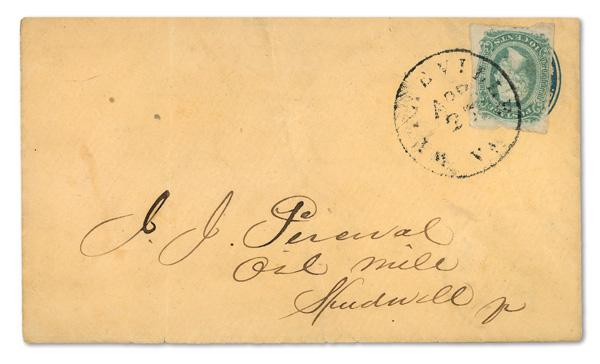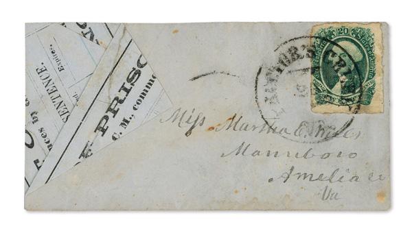 (unreadable date) Adversity cover from a used Army Prison Sentence form, franked by #13 with large margins at bottom and right to just into at left, tied by Proctor's Creek VA circular datestamp, addressed to Mannboro VA, Very Fine cover and an extremely rare adversity cover franked with the 20¢ green, with names written on the form, one does wonder what this cover carried that required double rate postage, ex Dietz; purchased from William R. Weiss Jr. (Image)