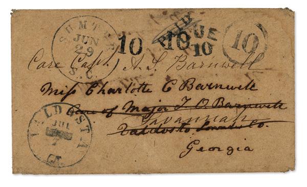c.1861 (Jun. 29) Turned cover with Sumter SC Paid/Due 10 forwarded to Savannah, then mailed back to Sumter, originally sent from Sumter SC with "Sumter SC Jun. 29" circular datestamp with "Paid" and "10" in circle handstamps on brown cover to Valdosta GA where forwarded to Savannah with "Valdosta GA Jul. 7" circular datestamp and "Due 10" handstamp, the "Paid" crossed out and stamped "10" twice to make clear to the Savannah PO that 10¢ postage was due, 1-2 years later, the cover was turned and addressed to Sumter with #11c, 3 large margins and ample at top, tied by "Savannah Ga. Paid Jul. 13" circular datestamp, Very Fine, a wonderful cover with multiple markings including the Sumter "provisional" markings, ex-Howard Green (with his backstamp). (Image)