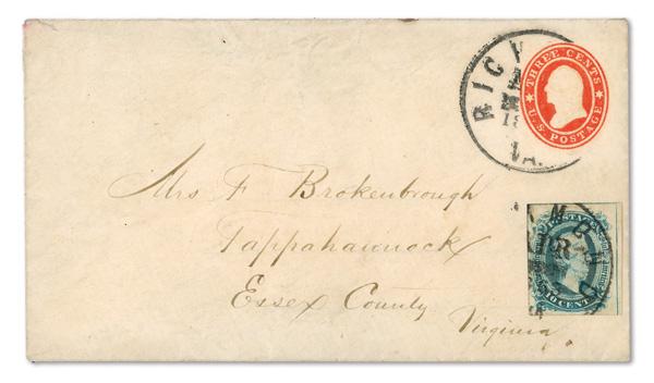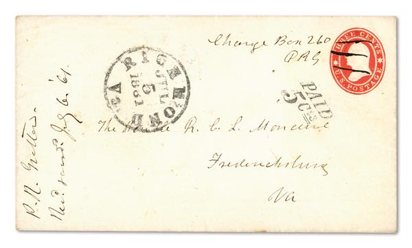 1861 (July 5), Adversity use of 3c Red Star Die entire (US #U26) with address lines, sender has crossed out obsolete indicia and written "Charge Box 260 PRG" indicating box charge for 5¢ postage, well-struck "Richmond VA Jul. 5, 1861" circular datestamp and "PAID 5 Cts." two-line italicized rate handstamp with next day receiving docketing, addressed to Fredericksburg VA, Extremely Fine and unusual, ex-Emerson & Brugh. (Image)