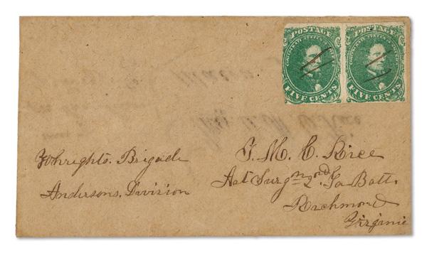 c.1862, Turned cover to a surgeon in the 2nd Georgia, #1 Stone 1 horizontal pair with large margin at top to into at left, each stamp with two short pen line cancels, on cover addressed to "T.M.C. Rice, Ast. Surgeon 2nd Ga Batt. Wright's Brigade, Anderson's Division, Richmond VA", inside is addressed to Mrs. T.M.C. Rice in Macon GA with a pair of #7 that does not belong, Extremely Fine, see the inside online, with 1997 Brian Green certificate. (Image)