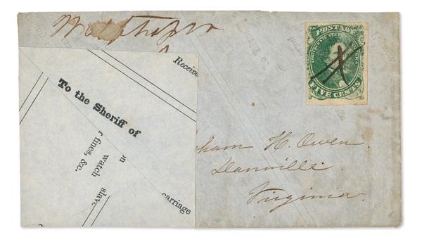 c. 1862, Adversity cover made from unused Sheriff form, 5¢ green, Stone 1, large margins at bottom, full at top and right, close at left, small fault, pen cancel, manuscript "Wolf Trap VA" cancel, on unused form that appears to be instructing a Sheriff to collect unpaid county or revenue taxes on a variety of things including carriages, horses, slaves, tithes, plus any fines, addressed to Danville VA, bottom left flap folded over for display, Jack E. Molesworth description on top backflap, Very Fine advertsity cover from a very small town. (Image)