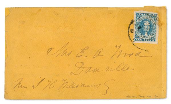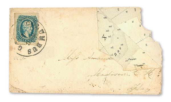 c.1864 Adversity cover made from navigational chart of entrance to Galveston Bay, franked with #11 with large margins all around and tied by "Columbus GA Aug. 4" circular datestamp addressed to Madison Fla., cover faults, otherwise Fine. (Image)