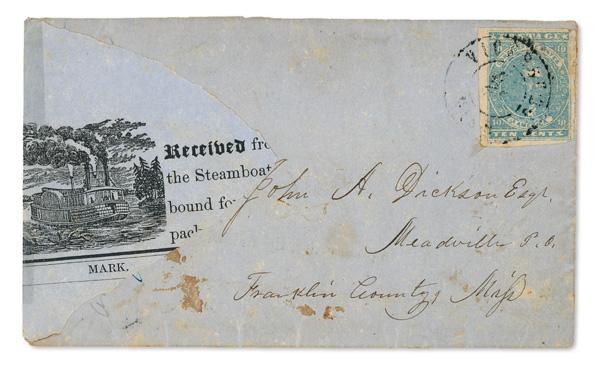 1862, Adversity cover with #2 on unused steamboat printed form, stamp with full to large margins all around in a lighter shade than usual, tied by Vicksburg Miss. double circle datetamp with unclear date, addressed to the very tiny town of Meadville Miss., 1862 docketing, left side flap tape reinforced and folded over for display, signed Kimbrough. (Image)