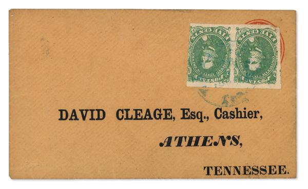 1862 (Feb. 23), Adversity cover with 5¢ green pair on US 3¢ Nesbitt entire with David Cleage printed address, #1, stone 1, horizontal pair, three full to large margins, just into at left, affixed over indicia of US 3¢ Nesbitt entire with "David Cleage, Esq., Cashier, Athens, Tennessee" printed address and embossed "Planters Bank, Nashville" corner card on top backflap, pair tied by blue "Nashville, Ten., Feb. 23, 1862" circular datestamp, fresh and Extremely Fine. An attractive usage posted 12 days prior to the fall of Nashville to Union forces, ex Gallagher (who signed it) & William R. Weiss, pictured on page 8 in his Confederate States General Issue Stamps used on Adversity Covers, 1861-1865, currently available from the CWPS for $6. (Image)