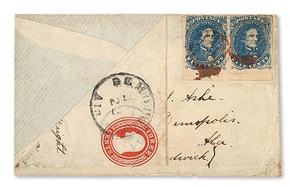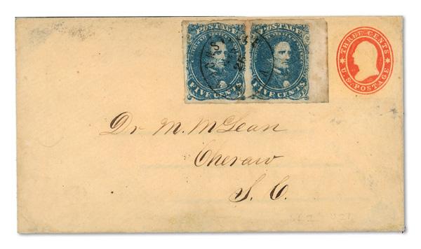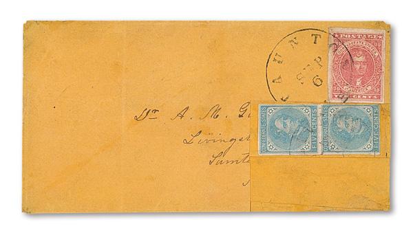 1862 (Apr. 23), Adversity cover with #4 pair on US 3¢ Nesbitt on buff (U10), #4 pair, Stone 2, with ample margins to into at bottom, tied by "Memphis Ten. Apr. 23, 1862" circular datestamp, addressed to Demopolis Ala., stamps lifted and hinged in place, Very Fine. The pair paid the double rate as the cover traveled under 500 miles, for which the rate increased from 5¢ to 10¢ per half ounce on July 1. Ex-William R. Weiss and pictured on page 21 in his Confederate States General Issue Stamps used on Adversity Covers, 1861-1865, currently available from the CWPS for $6. (Image)