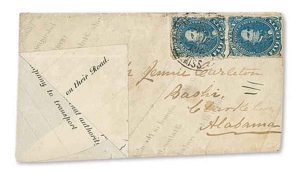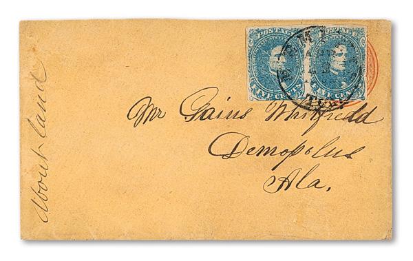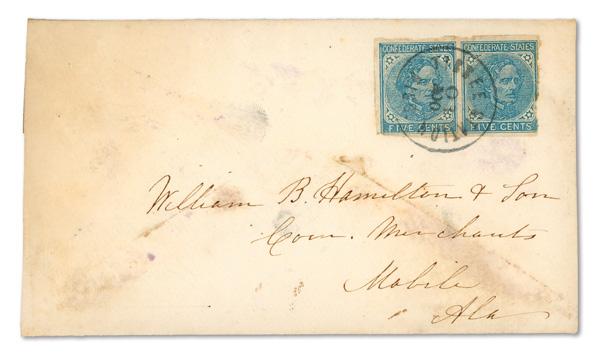 1863 (Oct. 10), Turned cover from Mobile Ala to Tibbee Station Miss. and sent back, #7 horizontal pair, tied by "Tibbee Station Miss. Oct. 10" circular datestamp addressed to "William B. Hamilton & Son, Comm. Merchants, Mobile Ala" and sent by Hamilton back to Tibbee Station Miss. 10 days later with top margin single of #12, pencil message on back that reads, "Don't you think we had better send off the cows immediately. Hamilton will sell them for me.", opened at sides including cut into #12, Very Fine, see the inside online. (Image)
