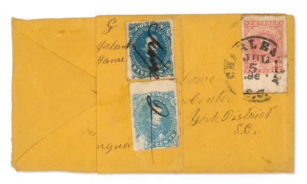 1862 (Jul. 5), Adversity cover with #5 & Nos. 4 & 4b, initially used with #4 (four margins) & 4b (sheet margin at top, full to into other sides, small fault at bottom left) tied by large "July 2" manuscript "J.J. Howe C.S. Comp. G, 18th Regt. S.C. Vol, Charleston S.C. Camp on James Island" and addressed to "New Center SC care of Capt. Beauregard", then turned and franked with #5 with wide sheet margin at bottom and full to large margins other sides, tied by "Charleston S.C. Jul. 5, 1862" circular datestamp and addressed to "Mr. J.M. Howe, New Center, York District, S.C.", Very Fine, an exceptional turned cover, signed Brian Green. (Image)