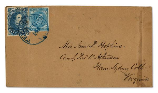 1862 (July 14), Adversity cover to a college then to Stonewall Jackson's personal chaplain, #4 & #6, each with 3 full margins, tied by single strike of blue "Petersburg VA Jul. 14" circular datestamp on buff cover to Mrs. Ann P. Hopkins at Hamilton Sydney College in Virginia, then turned by Mrs. Hopkins and franked with a #4 Stone 2 horizontal pair with full margins at top and bottom with pen cancels plus a "H.S. College V July 29/62" manuscript cancel, and sent to her husband "Revnd. A.C. Hopkins, Chaplain 2nd Reg. Va. Vols. Inf., Gen. Winder's Brigade in Gen. T.S. Jackson's Army of the Valley" (Shenandoah Valley), Extremely Fine and very pretty with the blue cancel tying the two different blue stamps, plus the added benefit of the Stonewall Jackson connection, with 1965 P.F. certificate.
