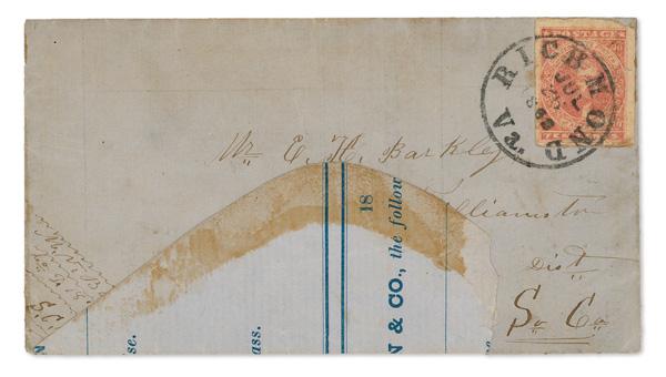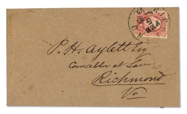 1864 (Feb. 5), Turned cover with 2¢ brown red #8 and #13c 20¢ green bisect, 2¢ with full to large margins all around, tied by "Richmond VA Feb. 5" circular datestamp paying drop rate on brown homemade locally addressed cover, inside with #13c 20¢ green, horizontal bisect, uncancelled, effectively "tied" by mucilage toning, addressed to Loch Lomand VA, 20 Jan. '64 receipt docketing at left, Very Fine, the 20c bisect was not cancelled, suggesting that the letter was hand carried to Loch Lamond and then to Richmond where it was reused; this appears to be genuine in every respect, a wonderful usage. See the inside online, ex-Caspary (HR Harmer Oct. 9, 1957 auction lot 565), signed Raymond H. Weill & Co. (Image)