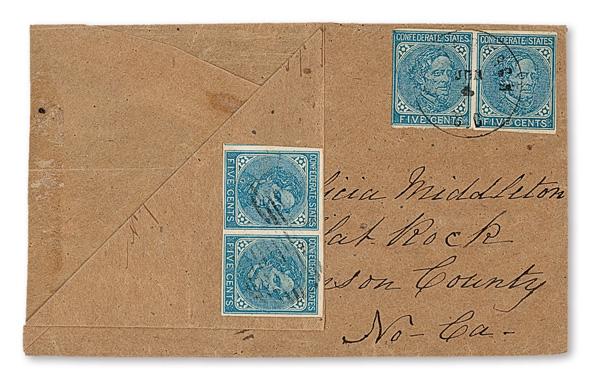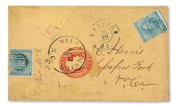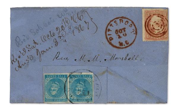 1866 (Oct. 16), Turned cover with #6 pair during the war and #65 after the war, originally franked with #6 horizontal pair tied by faint Fayetteville NC circular datestamp to Pittsboro NC, then turned and franked with US #65 cancelled by dark red target with matching "Pittsboro NC Oct. 16" circular datestamp alongside to Elizabeth City NC, docketing reads "Rec'd Octo. 20th '66/Ans'd Jan. 3rd 1867", opened at bottom and right, Very Fine and unusual usage of a turned cover sent during and after the war, Jack E. Molesworth description on top backflap. (Image)