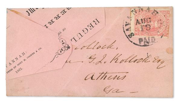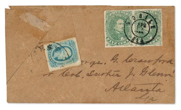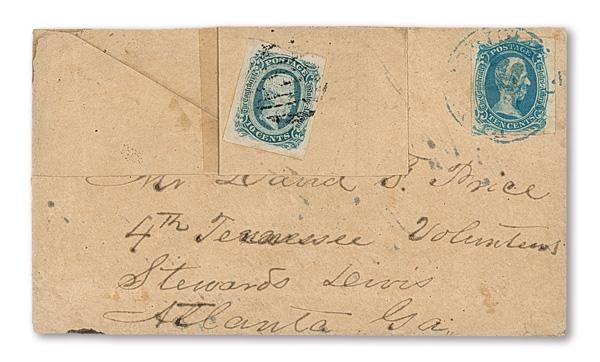 c.1864 (undated), 10¢ milky blue, "T-E-N" turned with #12 Army grid cancels, clear to large margins, well tied by blue Ga. circular datestamp and addressed to a member of the 4th Tenn. Vols., Stewards Division, Atlanta GA, inside with four margin #12 tied by army grid and addressed to Macon GA, Fine to Very Fine, Jack E. Molesworth descriptioni on top backflap, with 1996 C.S.A. certificate. (Image)