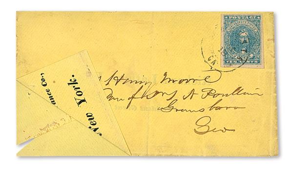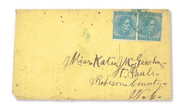 c.1863, Adversity cover made from yellow handbill for "Conservative Ticket. For Governor, Z.B. Vance of Buncombe", franked with #7 pair with clear to full margins tied by blue circular datestamp described by Weiss as Richmond but we aren't sure we agree, cover exploded with left side flap and part of bottom flipped onto front for display, Very Fine and a stunning showpiece, ex-William R. Weiss and pictured in his book "Confederate States General Issue Stamps used on Adversity Covers, 1861-1865", currently available from the CWPS for $6.