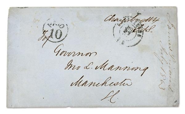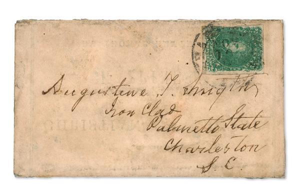 1863 (Jul. 23), Adversity cover made from an unused 1st Regiment of Artillery S.C.M. Court Martial Form, "Charleston S.C. Jul. 23" double circle datestamp and matching "Paid 10" in circle cancel, addressed to "Governor Jno L. Manning Manchester SC", charge box no. and 1863 receipt docketing at right, Very Fine. (Image)