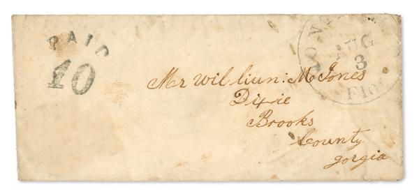 1863 (Aug. 3), Adversity cover Florida use, "Monticello Flor. Aug. 3" circular datestamp with "Paid 10" (Type III) handstamp on small turned cover to Dixie Ga., inside with damaged 5c Green (1) cancelled by grid and sent from Salem NC to Quitman Ga., slight wear, Fine, ex Agre, signed Trish Kaufmann and Brian Green, with 1991 Brian Green certificate. (Image)