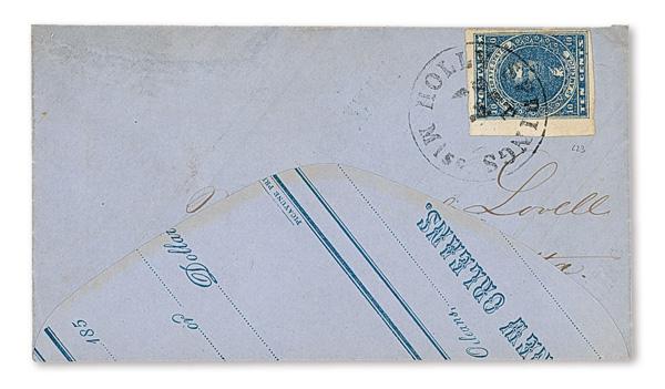 c.1863 (Oct. 7), Adversity cover from blue Bank of New Orleans unused checks, franked with #2b with deep dark color and strong impression as often found in Hoyer & Ludwig printings, but this stamp has Paterson plate characteristics, huge left sheet margin, other sides full to close but well clear at right, tied by well struck "Holly Springs Miss. Oct. 7" circular datestamp and addressed to Marietta GA, bottom backflap folded over showing "New Orleans" and part of Picayune Press imprint, top backflap and small part of upper left expertly restored, Extremely Fine appearance. (Image)