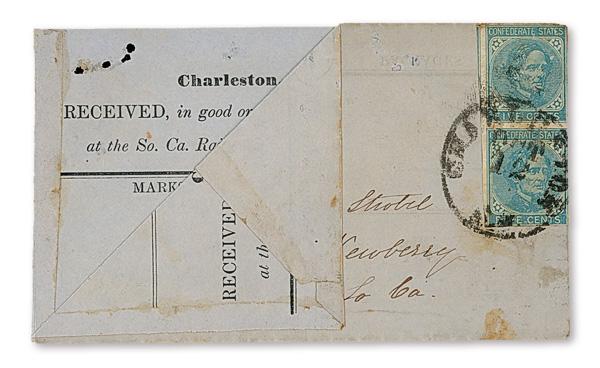 c.1863 (Oct. 12), Adversity cover made from South Carolina Railroad Depository blank printed package receipt form, franked with vertical pair of #7 local printing on De La Rue paper, wide margin at left, other sides close to slightly cut into, tied by "Charleston S.C. Oct. 12" circular datestamp, addressed to Newberry S.C., minor insect damage, otherwise Fine and scarce appearance of #7 printed on De La Rue paper on cover, see the inside online. (Image)