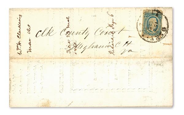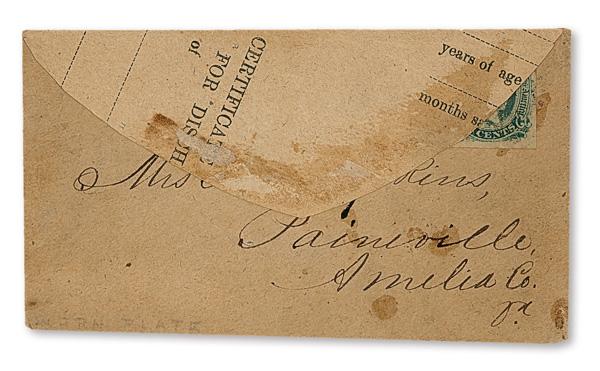 c.1864 Adversity cover made from Confederate Army discharge form, franked with #11, dry print, two full margins and two touching, dry print, target cancel, addressed to Paineville VA, top flap folded over front for display, Very Fine. (Image)