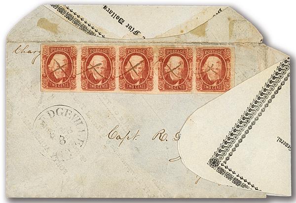 c.1864, 2¢ brown red strip of five on cover made from a land transaction form, strip with full to large margins all around, rich color, individual pen "X" cancels, "Milledgeville GA Feb. 8" circular datestamp, addressed to "Capt. R.D.B. Taylor, Athens Georgia", charge box notation at top right partially covered by strip, right stamp with light crease not noted on certificate and only visible under magnification, still an Extremely Fine strip and an extraordinary adversity cover made from a land transaction form featuring a #8 strip of five, see the cover fully exploded online, ex-William R. Weiss and pictured on page 54 of his Confederate States General Issue Stamps used on Adversity Covers, 1861-1865, currently available from the CWPS for $6. Weiss also wrote on page 54, "The fact that we were only able to acquire six adversity covers bearing this stamp in the decade we collected this area clearly shows the scarcity. Strips, of course, are particularly rare.", with 1966 P.F. certificate. (Image)