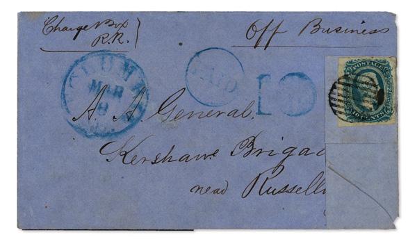 1864 (Mar. 8) Turned cover addresses Kershaw's Brigade and City Hall Hospital, one side is franked with #11, large margins, deep shade, tied by perfectly struck 7-bar grid cancel with "Winnsborough S.C. 9 Nov." circular datestamp and manuscript "Lizzie Dwight Nov. 12th, 1864", on blue turned cover to "Dr. Richard Y. Dwight, City Hall Hospital, Macon Georgia", other side with blue "Columbia S.C. Mar. 8" circular datestamp, matching "Paid" in circle and large "10" handstamp, manuscript "Charge box R.R." and "Off. Business", addressed to "A.A. General, Kershaw's Brigade near Russellville Tenn." (William Moultre Dwight was assigned to be Acting Assistant Adjutant and Inspector General to Brigadier General Kershaw in June 1862, meaning this cover was addressed to him), cover exploded and area around stamp folded over for display, Very Fine and a premium cover with military and medical elements and a family connection., see the other address panel online.