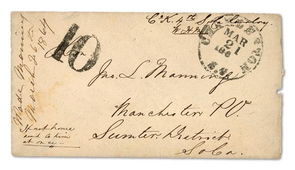 1864 (Mar. 21), Soldier's adversity cover made from a legal document, with "Charleston S.C. Mar. 21, 186-" circular datestamp and matching large "10" handstamp, from a soldier in Company K of the 4th South Carolina cavalry, addressed to Manchester P.O. SC, 1864 receipt docketing at left, opened for display with right side flap detached, Very Fine. (Image)