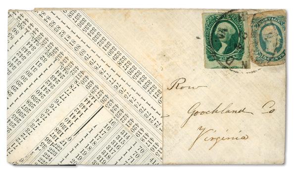 c.1864 (Apr.(?) 24), Adversity cover from 20¢ green & 10¢ deep blue, Keatinge & Ball, former with part of adjacent stamp at bottom, both stamps tied by "Richmond VA Apr.(?) 24" circular datestamp on adversity cover made from actuarial table addressed to Haydensville VA, cover slightly reduced at right into 10¢, still a Very Fine and rare combination to pay a scarce triple rate, #13 on cover alone has a catalog value of $1,250. (Image)