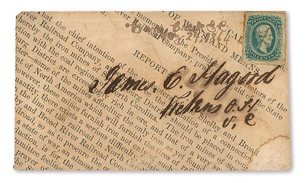 1864 (May 29), Soldier's Adversity cover made from CSA Committee of Ways & Means report regarding using the railroad to transport iron and coal, franked with #11 with full to large margins all around, single short pen stroke with matching "Cane Creek S.C. May 24, 1864" postmark, addressed to James E Hagood at Pickens C.H. S.C., with original letter from a Col. Maxwell state of the new district, Fine to Very Fine cover and letter, see the other side of the cover and the letter on the web. (Image)