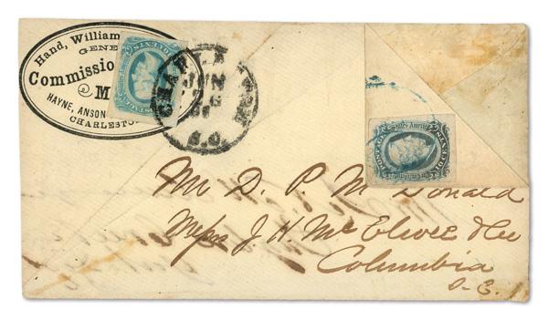 c.1864 (June 26) Adversity cover with advertisement at top left, franked with #12, bright color and full margins all around, tied by "Chareston S.C. Jun. 26, 186?" circular datestamp on "Hand, Williams & Wilcox Commission Merchants" large oval corner card to Columbia SC, inside franked with #11 tied by blue Columbia circular datestamp and addressed to Taylors Creek S.C., stamp folded over for display, Very Fine, ex-Kohn (with his backstamp). (Image)
