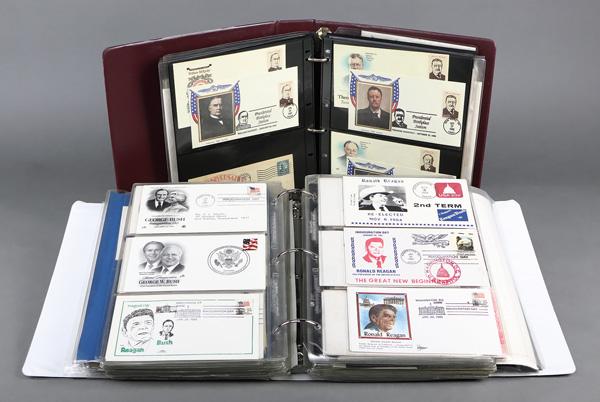 Presidential Inauguration Covers and More, 1929-2020, two binders chock-full of politically-related envelopes; First Day Covers and commemorative covers (about 150) with many related to the AMERIPEX 22¢ Presidential Series; Inaguration covers include; Hoover (2), Coolidge, FDR (30), Truman (3), Eisenhower (8), JFK (7), Johnson (13), Nixon (19), Ford (14), Carter (24), Reagan (54), Bush (10), Clinton (5), George W (31), Obama (60), Trump (3), and Biden (4); let the games begin! Fine to Very Fine. Shipping charges apply - weight 17 lbs. (Video for this lot) (Video2 for this lot) (Image)