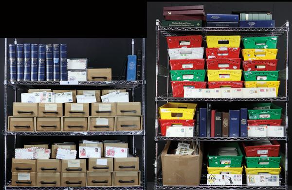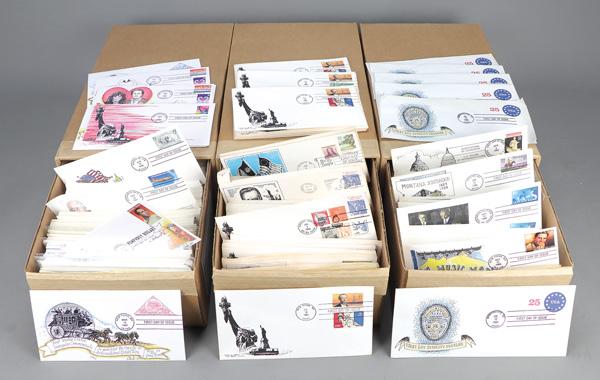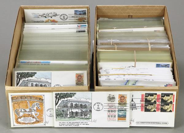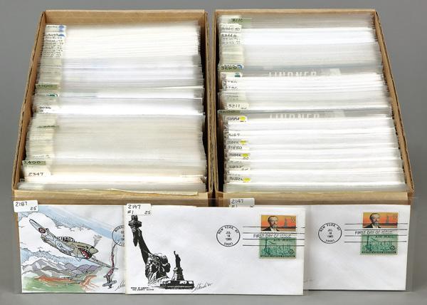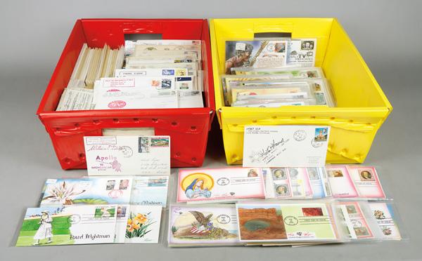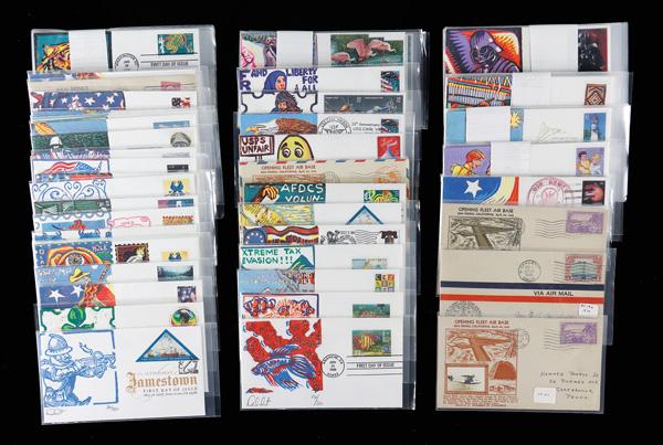 First Day and Event covers 1965-2010, three dozen binders of mid to late 20th century material' oversized Fleetwood Presidents of the United States of America (with slipcase), Postal Commemorative Society Historic Stamps of America (200 envelopes), Showgard binder with 104 ArtCraft unaddressed 1961-1978; Mystic binder with 125 better FDCs including Fleetwood, ArtCraft, Ken Boll, Aristocrats, House of Farnam, Artmaster, Anderson, Colrono "Silk", USPS, Steelcraft, Staehle, Ellis, Jackson, Western "Silk", Gill Craft, and Smartcraft; Supersafe with about 50 Colorano "Silk" on postal cards (no duplication), Elbe binder with Colorano "Silk" series (Fish, Presidents of the United States, Polar Explorers, Navajo Art, Folk Art, Transportation, and American Wildlife), Enor binder with ArtCraft 1978-1980 and a second 1980-1982, Elbe 1987-1988, massive Franklin Philatelic Society American Revolution Bicentennial FDC Collection, pair of ENORMOUS New York Times Philatelic History of the United States (will require a reinforced coffee table), 1993 Federal Duck print remarque, two sets of mint 1893 World's Fair postal cards on Robert A Siegel auction cards, pair of 1983 World's Fair tickets on Mathew Bennett auction card; plus several hundred more better covers in binders; wow, Fine to Very Fine. Shipping charges apply - weight 193.4 lbs. (Image)