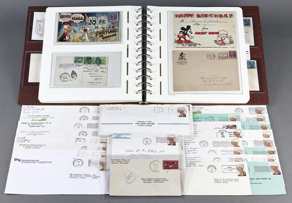 Extraordinary Early Disney Collection, 1931-44, Large Lighthouse binder and slipcase housing very early Disney material; some are handrawn and others are business corner cards, all would look stunning in a topical exhibit of Walt Disney; includes vintage photographs of Disney from Jack Hannah (early Disney animator), 1931 envelope addressed to Mickey Mouse from Canton China, 1930 domestic China cover (Soochow CDS) with printed Minnie Mouse in upper corner, 1934 Brazilian promotional mailer, 1932 full cover pen and ink of Mickey, oversized 1940 multicolor painted envelope with Donald Duck from South Africa, 1938 Happy Birthday greeting from Pevely Mickey Mouse Birthday Club in St Louis (includes envelope with corner card), 12 QSL cards postally used, and much more; check out online, Fine to Very Fine. Shipping charges apply - weight 8 lbs. (Video for this lot) (Image)