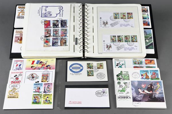 Love of Disney Worldwide Cover Collection, 1969-98, Deluxe Lighthouse binder and slipcase with collection of First Day Covers celebrating Walt Disney the world over; sets include 45 envelopes in the binder (as well as mint and used blocks of stamps), and an additional 90 with attractive cachets and unaddressed; countries include Lesotho, Sierra Leone, Commonweath of Dominica, Grenadines, Grenada, St Vincent, Bhutan, Antigua, Redonda, Anguilla, Maldives, Mongolia, Saint Lucia, Togolaise, Turks & Caicos Islands, Sharjah, and San Marino; it's a small world after all, Fine to Very Fine. Shipping charges apply - weight 8.4 lbs. (Video for this lot) (Image)