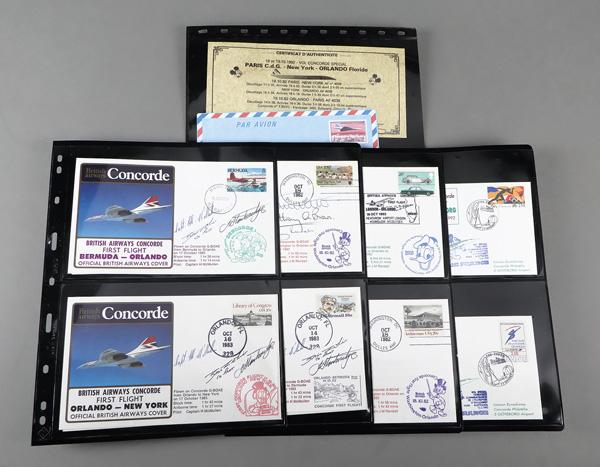 "It's a Small Worldwide" Concorde with Disney Cachets Collection, 1982-91, 14 premium European sized FLOWN envelopes carried at mach 2 on the Concorde on black Vario pages; Air France flights include Goteborg-Paris (3), Paris-New York-Orlando, and New York-Orlando; British Airways flights include London-Orlando (another autographed), Washington-Orlando (another autographed), Orlando-Washington (another autographed), Orlando-Bermuda (autographed), Bermuda-Orlando (autographed), Orlando-New York (autographed); high speed, low drag. Shipping charges apply - weight 0.9 lbs. (PDF for this Lot) (Image)