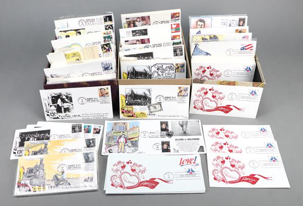 Nikirk dealer stock 1985-1997, 900+ hand painted First Day Covers produced by Herbert Kikirk in limited quantities; individually sleeved (unless in sets), unaddressed, and organized by catalog number with light duplication perfect for the online reseller in a pair of dealer drawers; sets include Statehood Bicentennial, 50th Anniversary of World War II, 1996 Summer Olympic Games, Classic Movie Monsters, Celebrating the Century, 100th Anniversary Trans-Mississippi Exposition, American Art, Hollywood Composers, Broadway Composers, and more; great stuff, Very Fine. (PDF for this Lot) (PDF2 for this Lot) (Image)