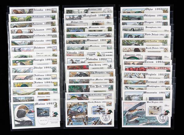 Collins State Duck Collection 1992, 45 State Ducks on Collins limited edition multicolored envelopes; each is unaddressed, postmarted in the correct state, and individually sleeved; wonderful stuffer specific to that stamp with each cover; you will fall in love with Ducks, Very Fine. Shipping charges apply - weight 1.6 lbs. (PDF for this Lot) (Image)