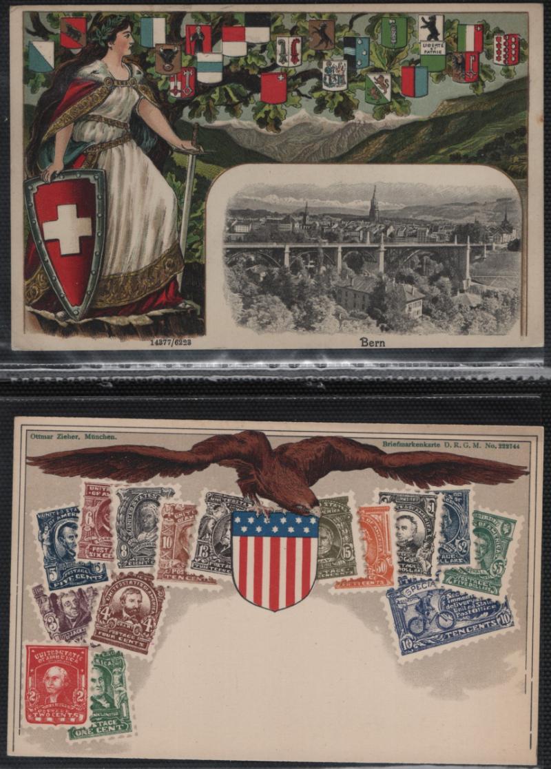 EUROPE Album w/ (98) better PPC 1900s-30s, mostly 1910s Germany & Switz; incl (35) cards w/ postage stamp images by Zieher or others, some w/ town views or crests, one is a sample; several fancy Gruss aus (Dresden, Heidelberg, Luzern), folks on bicycles, train, a few from Britain, NYC, Japan, humor, royals, Hamburg-Amerika line, soldiers, more; some mailed, gen F-VF, valuable group (Image)