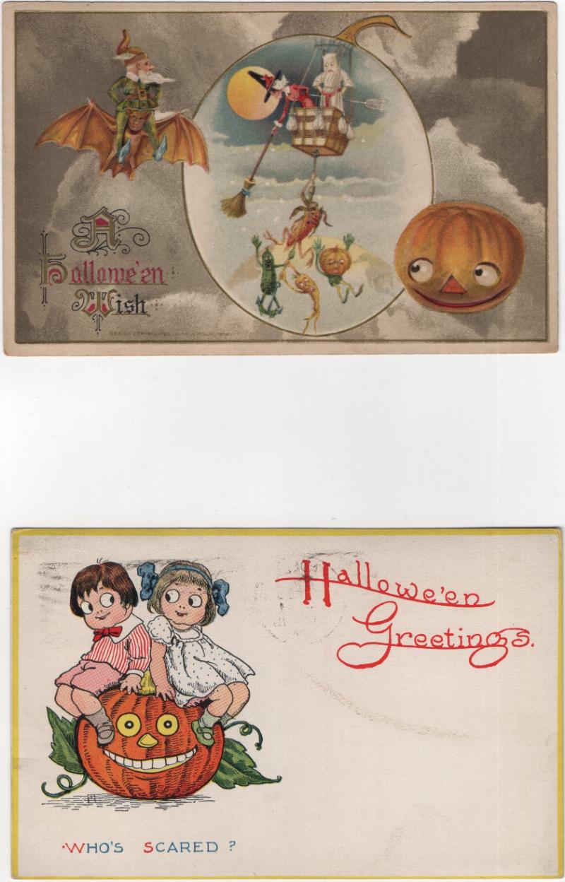 (5) Better cards, Wolf & Co No. 1 girl w/ JOL & black cat; witch sitting by fire; Tuck #150 pumpkin driving witch in melon car; Gibson Art w/ boy & girl sitting on JOL; Winsch w/ veggies hanging from balloon carrying witch & ghost; most mailed, a few nicks & wear, F-VF (Image)