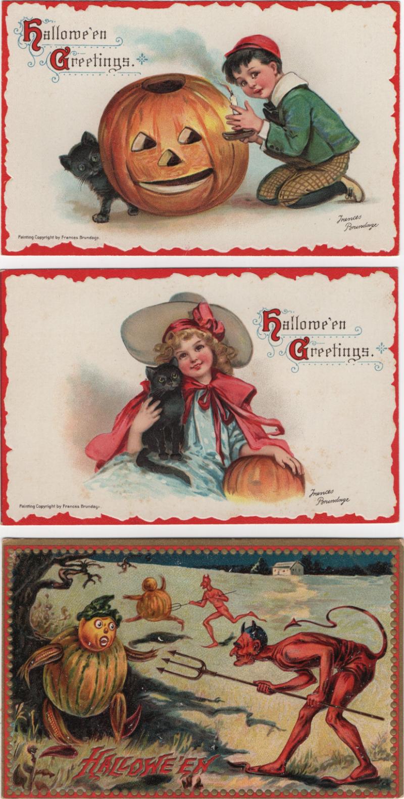 Selection (10) vintage Halloween cards, noted (3) Brundage, (2) Clapsaddle, (2) embossed Tuck's w/ devils & pumpkins, (3) others (all shown on web photos); three mailed, one w/ foxing, expect some minor corner wear, gen F-VF Boo! (Image)