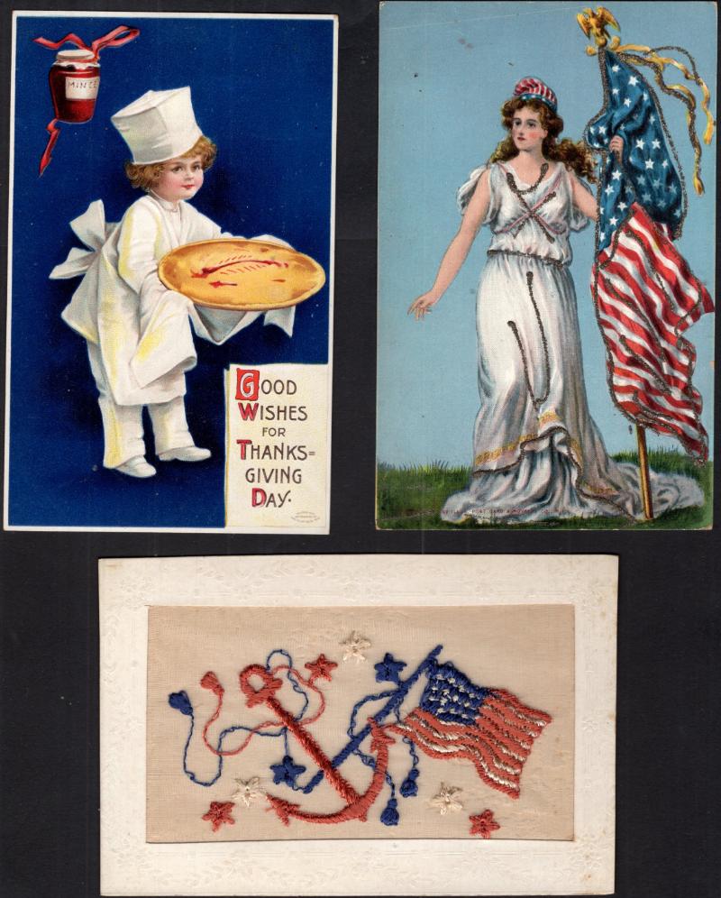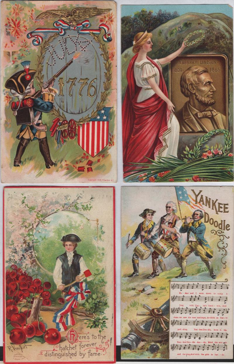 (400+) Quality vintage cards w/ patriotic designs: flags, allegories, George Washington, Decoration Day, series of state capitols, a few military; colorful, some fancy, some mailed, some typical wear, gen F-VF (Image)