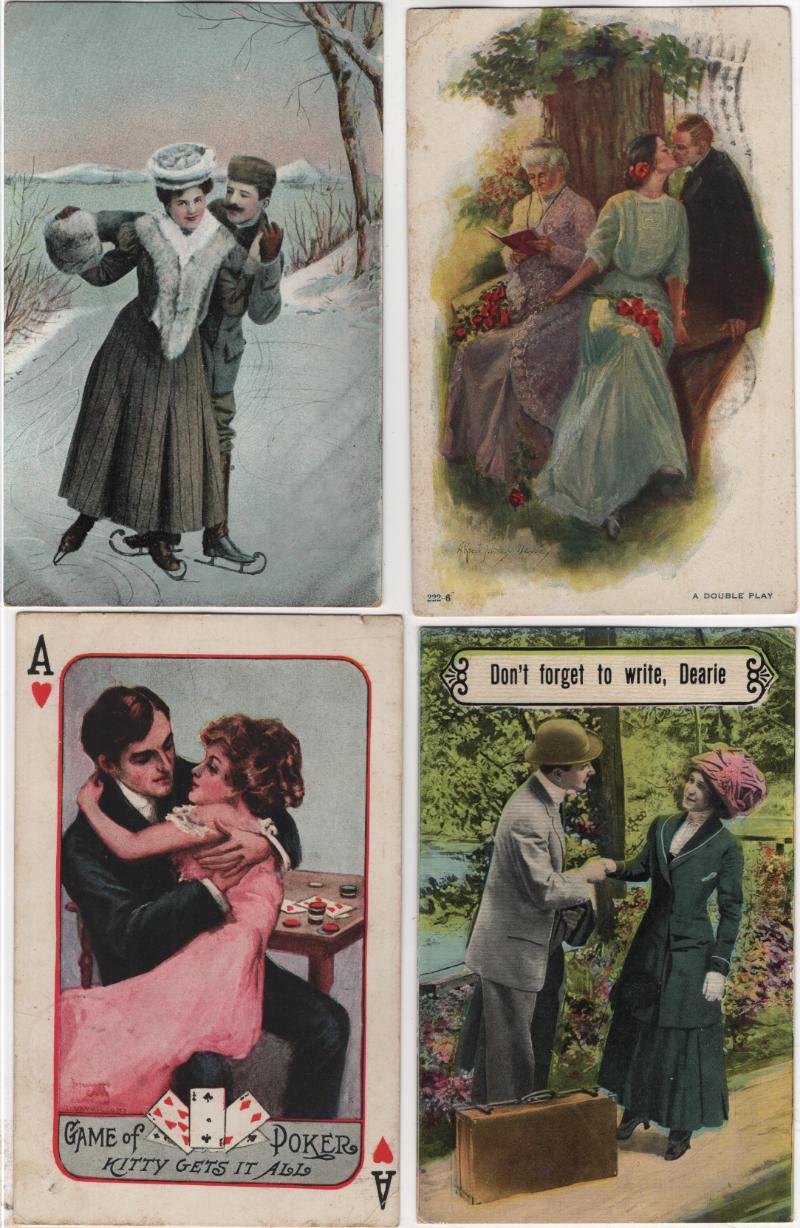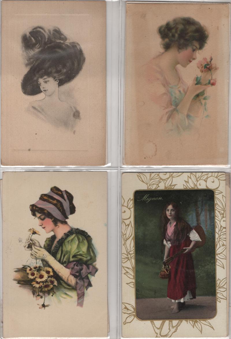 Old shoe box filled w/ (100s) vintage cards w/ pretty ladies or other scenes of romance or family life; artist signed, humor, w/ children, wooing, on the beach, a few European, more; quality accum, minor typical wear, some mailed, some undivided backs, gen F-VF (Image)
